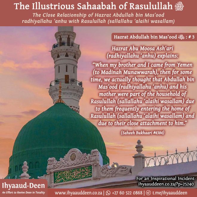 When Hazrat Sa’eed bin Zaid (radhiyallahu ‘anhu) passed away, then Hazrat Sa’d bin Abi Waqqaas (radhiyallahu ‘anhu) and Hazrat Abdullah bin Umar (radhiyallahu ‘anhuma) were among the people who gave him ghusal. After the ghusal, the janaazah was carried by the people from Aqeeq to Madinah Munawwarah to be buried in Baqi’, the graveyard of Madinah Munawwarah. When the janaazah passed the home of Hazrat Sa’d (radhiyallahu ‘anhu), he (Hazrat Sa’d (radhiyallahu ‘anhu) entered his home to take a quick bath before joining the people in the burial. Before leaving his home, he addressed his family and said, “I did not take a bath because I participated in the ghusal of Sa’eed (radhiyallahu ‘anhu). Rather, I only took a bath due to the heat.” (Majmauz Zawaaid #14880)" class="ttip">