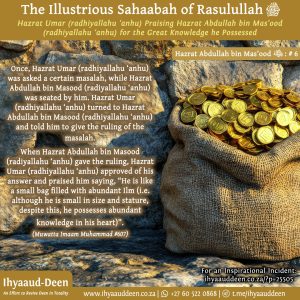Hazrat Abdullah bin Mas’ood (radhiyallahu ‘anhu) said, “I will go and recite the Qur’aan aloud before them.” The Sahaabah (radhiyallahu anhum) replied, “We fear over your life! We want that such a person should go before them and recite the Qur’aan aloud who has a strong clan to protect him from the people if they intend to harm him.” Hazrat Abdullah bin Mas’ood (radhiyallahu ‘anhu) responded saying, “Let me go, as Allah will protect my life!”